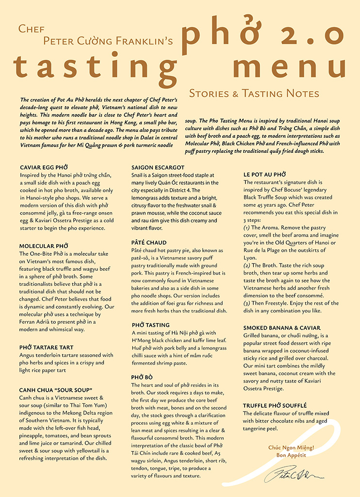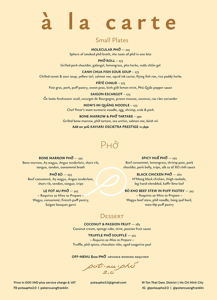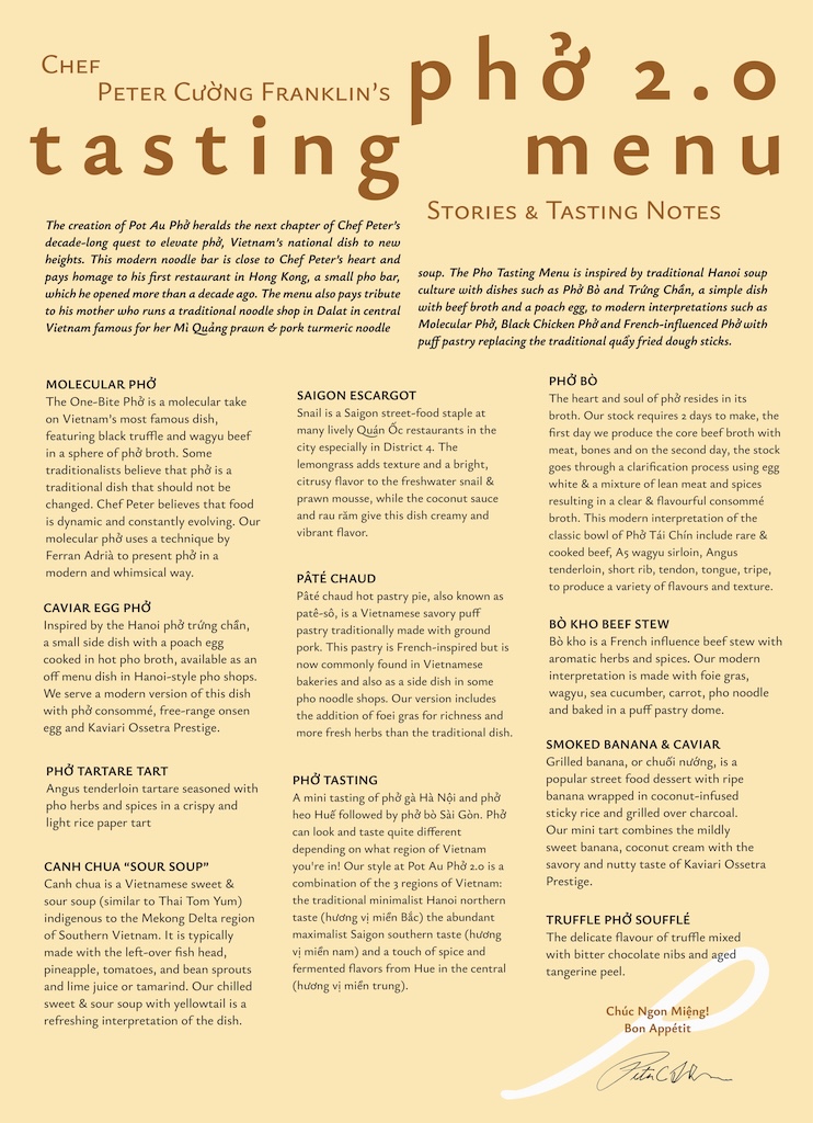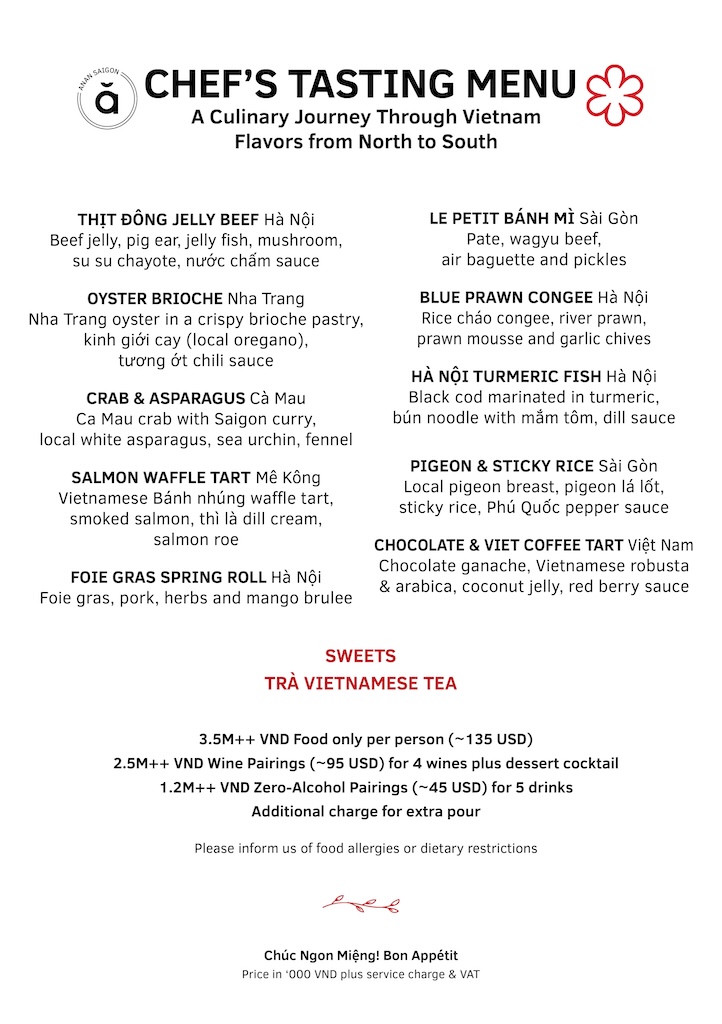 Chef Peter’s “Cuisine Mói” or “New Vietnamese Cuisine” reflects his vision of a modern Vietnam that is deeply respectful of its history and traditions yet progressive and international in outlook. He takes inspiration from the country’s vibrant food culture and uses fresh ingredients often sourced from local markets while incorporating French culinary techniques honed during his training at Le Cordon Bleu.
