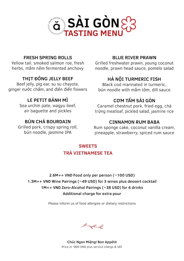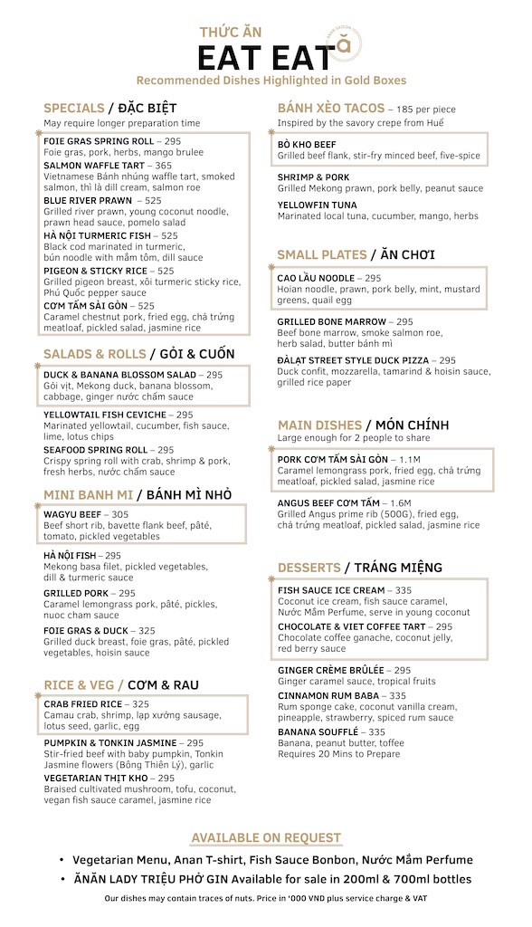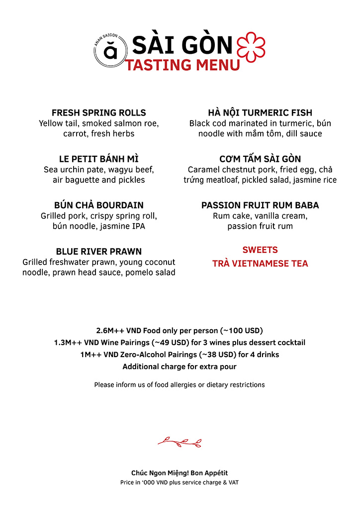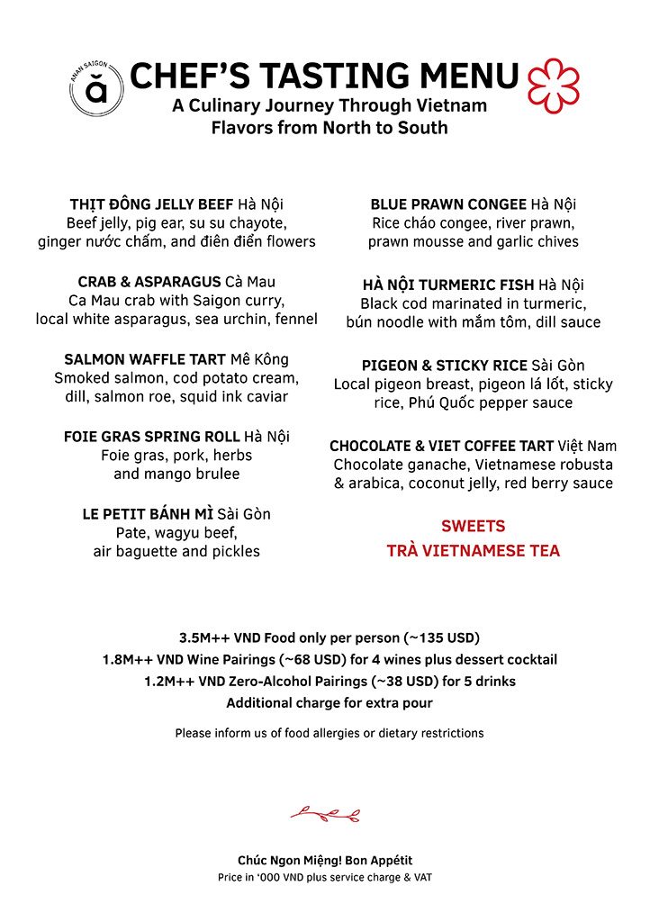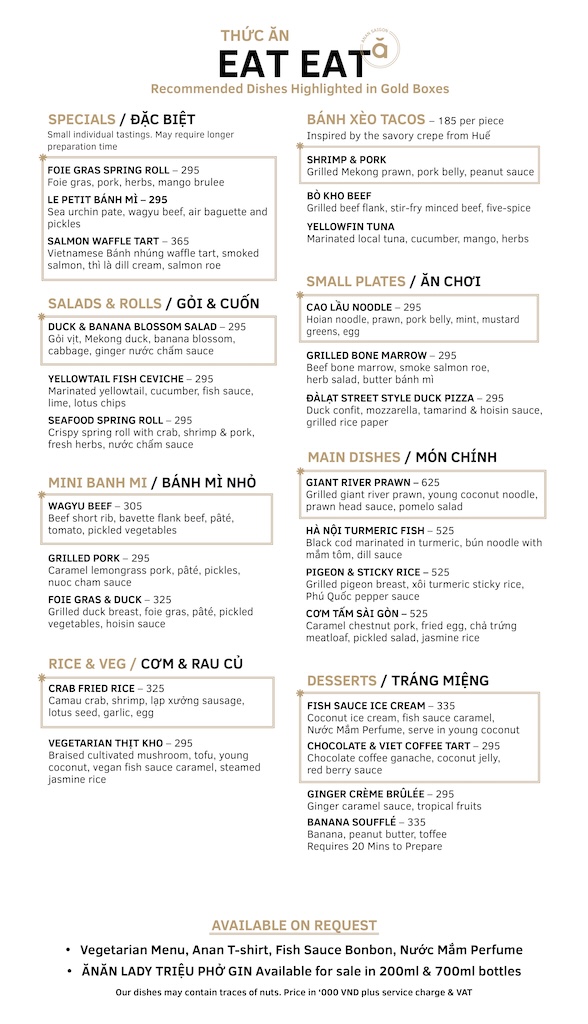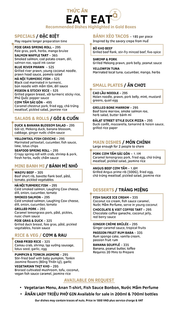 Anan Saigon currently offers two tasting menus which offer a perfect introduction to Chef Peter’s modern New Vietnamese Cuisine. The Saigon Tasting Menu showcases modern interpretation of classic Vietnamese dishes such as Le Petite Bánh Mì, Bún Chả Bourdain and Hà Nội Turmeric Fish. For an even more gastronomic experience, we recommend the Chef’s Tasting Menu, which details a culinary tour of the country with regional dishes from North to South. In addition, a full A La Carte menu features signature dishes such as Bánh Xèo Taco, Đà Lạt Street Style Pizza, Mekong Delta Fish, Cơm Tấm Saigon and Fish Sauce Ice Cream.