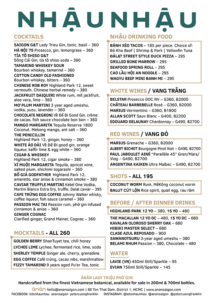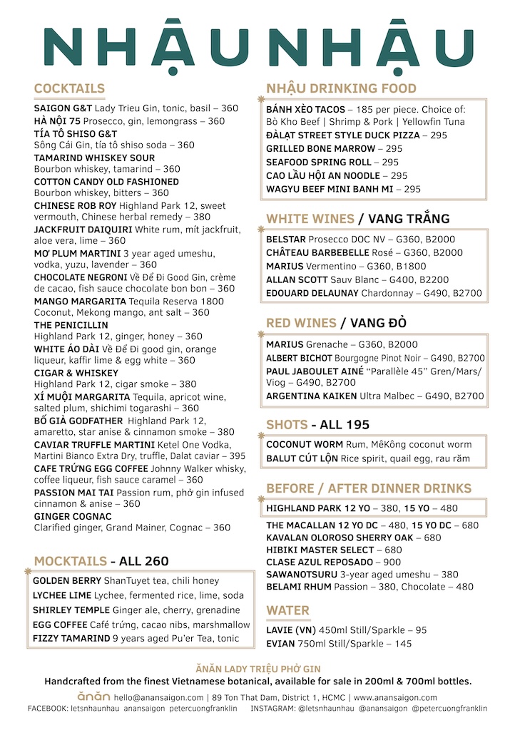 The Anan Experience can be found in an iconic “tube house”, a tall, thin building that typifies modern Vietnamese architecture. Upstairs from Anan, on the 2nd floor, is the cocktail bar Nhau Nhau. The name means “drink, drink” a tribute to Vietnam’s culture of after work drinking and eating. Before and after visits to any of the venues, guests can transition to the building’s Rooftop Dining Bar and take in the breathtaking views of the city center.